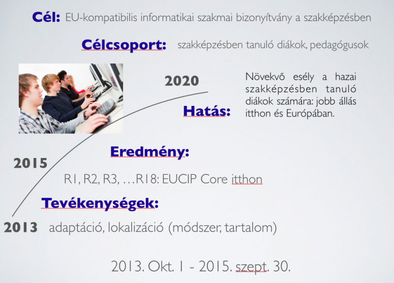 Az EUCIP képesítések (ITAF, EUCIP Core) tulajdonosa, az Olasz Számítástudományi Társaság képviselője, Fabrizio Agnesi és Pierfranco Ravotto (P1-AICA) megtartotta az előadását a EUCIP (European Certification of Informatics Professional) programot, és azon belül a EUCIP Core informatikai képesítést, amit a projekt keretében szeretnénk a magyar szakképzés számára honosítani. Ezt követően az Ír Számítástudományi Társaság képviselője (David Cleary) és az IS Fermi Pontedera olasz szakközépiskola tanárai (Adriana Fasulo, Cristina Cosci) egy-egy előadásban bemutatták a EUCIP képzéssel kapcsolatos tapasztalataikat. (A képre kattintva, megtekinthető az előadás a Prezi-ben.)